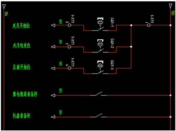 前三個為氣缸磁性開關檢測信號,后兩個為配套PLC傳送給機器人大包和托盤準備好的信號,為了實現電氣隔離,需要將PLC給機器人的電平信號轉化為機器人自身的電平,需要通過繼電器來實現。